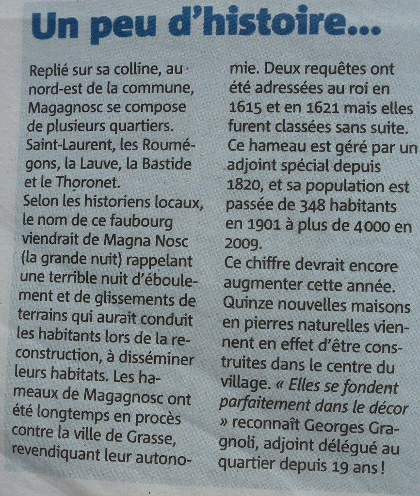 Les hameaux de Magagnosc ont été longtemps en procès contre la ville de Grasse, revendiquant leur autonomie ce qui, au regard, de certaines communes voisines alors bien moins peuplées, n’était pas dénué de sens. requêtes adressées au roi en 1615 et en 1621 n'apportèrent rien à cette cause. Le 29 novembre 1820 , Magagnosc obtient un adjoint spécial. En 1901, Magagnosc comptait 348 habitants. En 2011 il y en a 2200. (wikipedia)